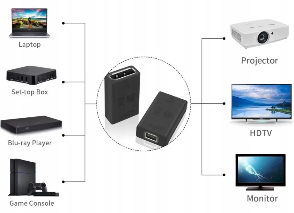Adapter Mini DisplayPort - DisplayPort F/F służy do podłączenia kabla wyposażonym we wtyk DisplayPort z kalem Mini DisplayPort. Dzięki tem możemy łączyć ze sobą urządzenia wyjściowe (laptop, komputer) z wyświetlaczami (monitor, rzutnik, telewizor) wyposażonymi w oba rodzaj złącz. Przejściówka działa w obu kierunkach. Możemy np. podłączyć komputer z wyjściem DisplayPort przy użyciu standardowego kabla DP-DP, poprzez przejściówkę i dalej kabel MDP-MDP do monitora z wejściem Mini DisplayPort a także laptop wyposażony w wyjście Mini DisplayPort do monitora z DisplayPort. do kabla ze złączem Mini DisplayPort i następnie do komputera bądź laptopa. Adapter działa w dwóch kierunkach. Dzięki tej przejściówce nie musisz kupować dodatkowych kabli - wystarczy wykorzystać posiadane już kable DP - DP i Mini DP - DP. Adapter nie umożliwia zmiany sygnału poza standard Mini DisplayPort i DisplayPort.