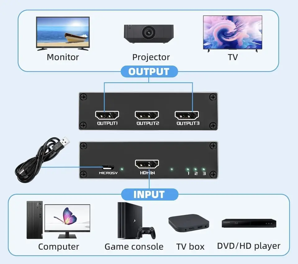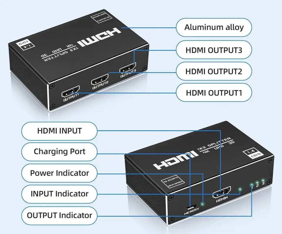 Splitter dodatkowo wzmacnia i regeneruje sygnał umożliwiając stosowanie kabli HDMI do 15m na wejściu i wyjściu. Jest zasilany ze standardowego złącza USB można go podłączyć do dowolnego urządzenia ze złączem USB lub adaptera sieciowego.