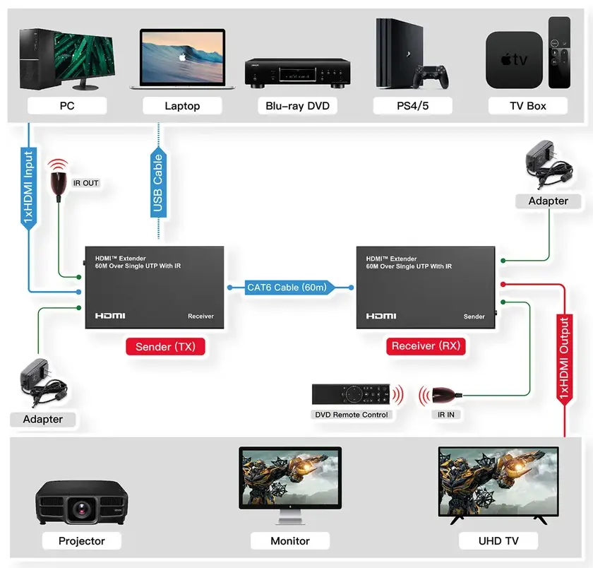 Urządzenie umożliwia podłączenie sygnału z dowolnego źródła HDMI do odległego odbiornika (telewizor, monitor, projektor itp.) poprzez skrętkę komputerową (patchcord) kat. 6. W zestawie znajduję się nadajnik (TX) oraz odbiornik (RX).