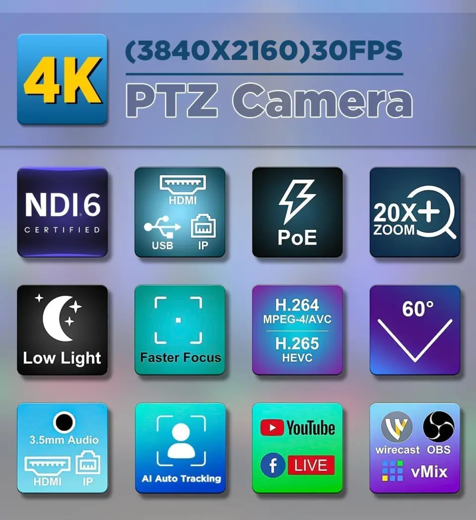 Kamera może współpracować z vMix, OBS, Wirecast i innymi oprogramowaniem do strumieniowania na żywo. Kompatybilny z mikserami wideo i kontrolerami PTZ, komputerami Windows, Mac itd. Obsługuje produkcję wideo z wieloma kamerami do strumieniowego przesyłania na żywo na YouTube i Facebook. Do zastosowania w różnych miejscach kamera jest również dostarczana z niezawodnym uchwytem ściennym i sufitowym. Oprócz tego posiada gwint montażowy 1/4 cala do zamocowania na statywie foto/wideo.
