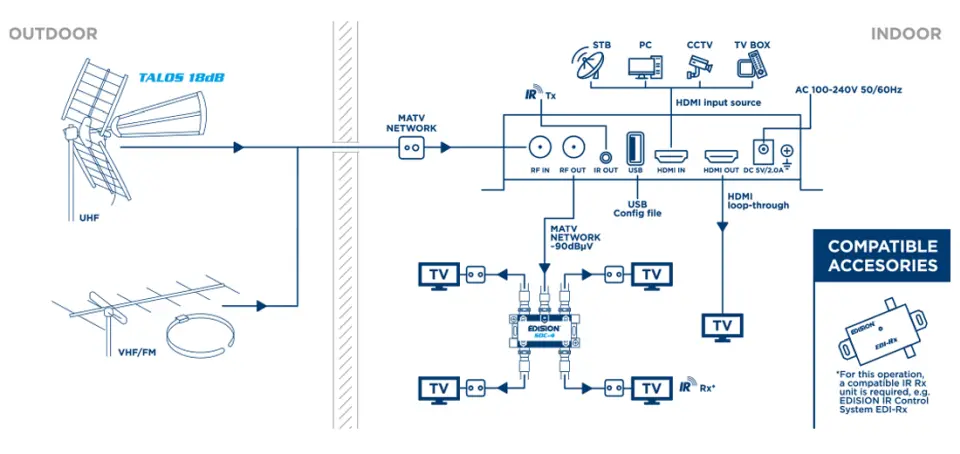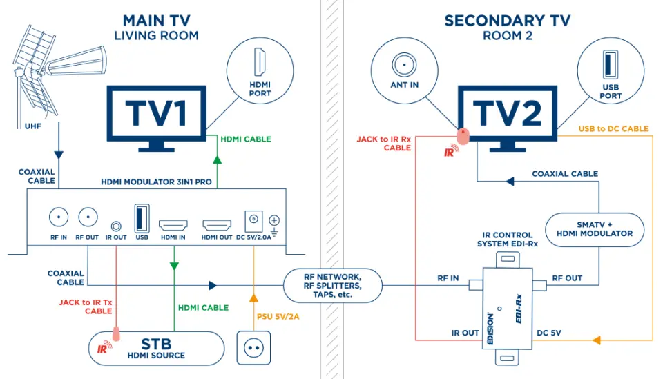 Modulator umożliwia rozprowadzenie sygnału HDMI z jednego źródła do wielu telewizorów poprzez zwykłą sieć antenową. Może służyć zaróno do przesłania sygnału HDMI po kablu koncentrycznym na dużą odległość jak i do stworzenia własnego kanału telewizynego w sieci kablowej.