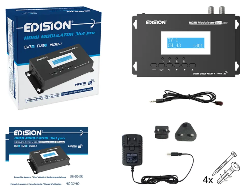 Masz jedno źródło sygnału wideo wysokiej rozdzielczości - dekoder telewizyjny, nagrywarkę z monitoringu CCTV, omputer, odtwarzacz itp. - i potrzebujesz idealnie rozprowadzić ten obraz na wiele telewizorów w całym budynku? Zapomnij o plątaninie drogich kabli HDMI i ograniczeniach odległości. Modulator EDISION HDMI 3in1 pro to profesjonalne i niezawodne rozwiązanie, które konwertuje sygnał z dowolnego źródła HDMI na cyfrowy kanał telewizyjny w standardzie DVB-T, DVB-C lub ISDB-T. Dzięki niemu możesz przesłać krystalicznie czysty obraz Full HD 1080p przez istniejącą instalację koncentryczną (antenową), docierając do każdego odbiornika bez utraty jakości i bez konieczności instalowania dodatkowych urządzeń przy każdym telewizorze. To inteligentny sposób na stworzenie własnego kanału TV, który jest tak prosty w instalacji, jak i potężny w działaniu.