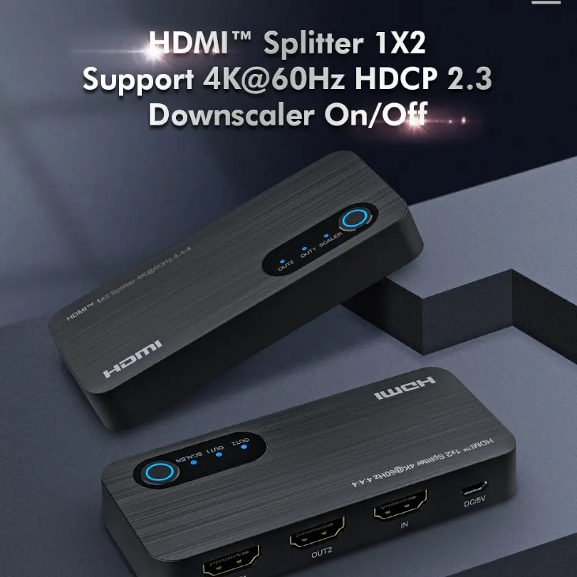 Rozdzielacz posiada również funkcję zmiany rozdzielczości (downscaling) jednego z wyjść. Dzięki temu mamy możliwość uzyskania obrazu na dwóch odbiornikach o różnej rozdzielczości, np. TV1 wyświetla obraz 4K a TV2 FullHD 1080p (obydwa w tej samej częstotliwości odświeżania, np. 60Hz).