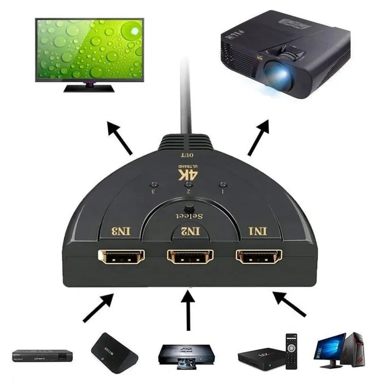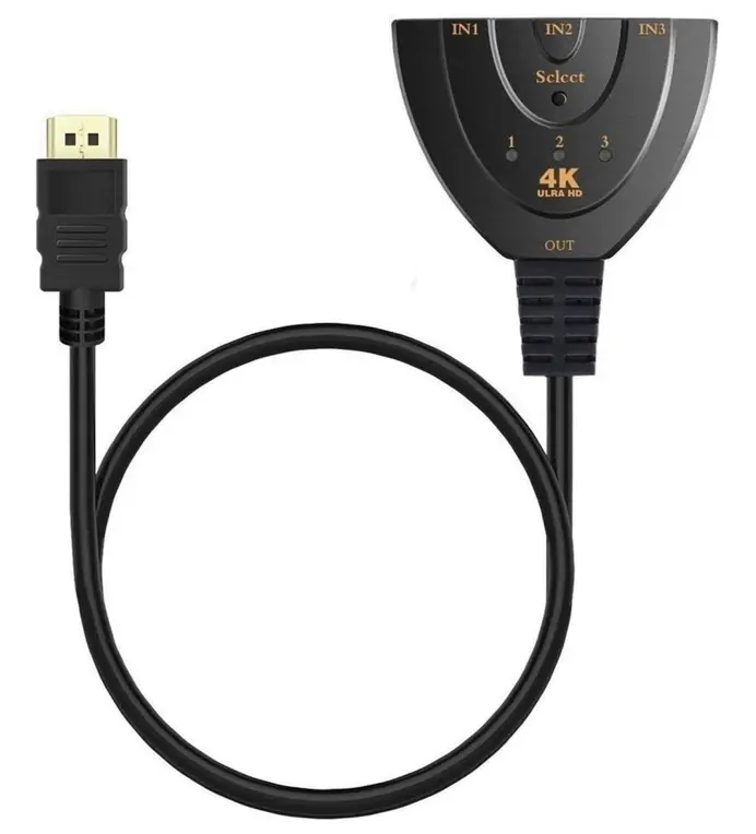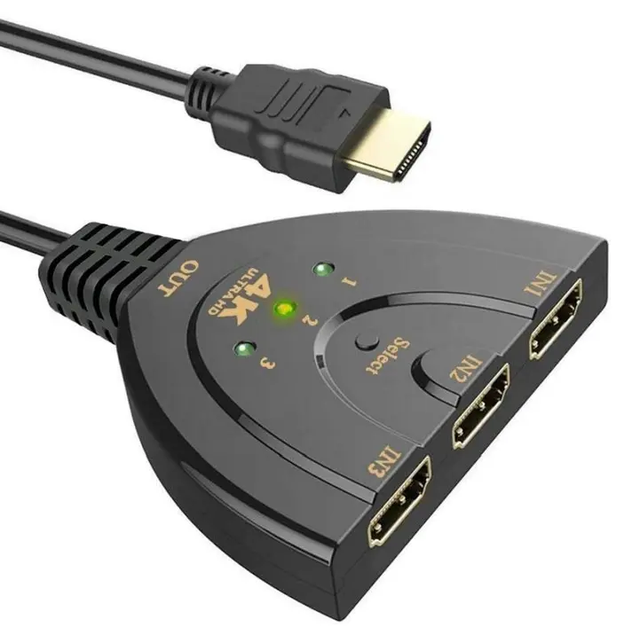 Prosty przełącznik możliwiający podłączenie 3 urządzeń, np. komputera, laptopa, odtwarzacza DVD, konsol, dekodera cyfrowego itp. do jednego odbiornika np. telewizora, monitora. Wbudowany przewód wyjściowy HDMI. Przełącznik umożliwia automatyczne przełączenie sygnału w sytuacji gdy aktywne jest tylko jedno źródło sygnału. W momencie gdy kilka źródeł jest włączonych równocześnie, wybór aktywnego odbywa się ręcznie przy pomocy przełącznika na obudowie.